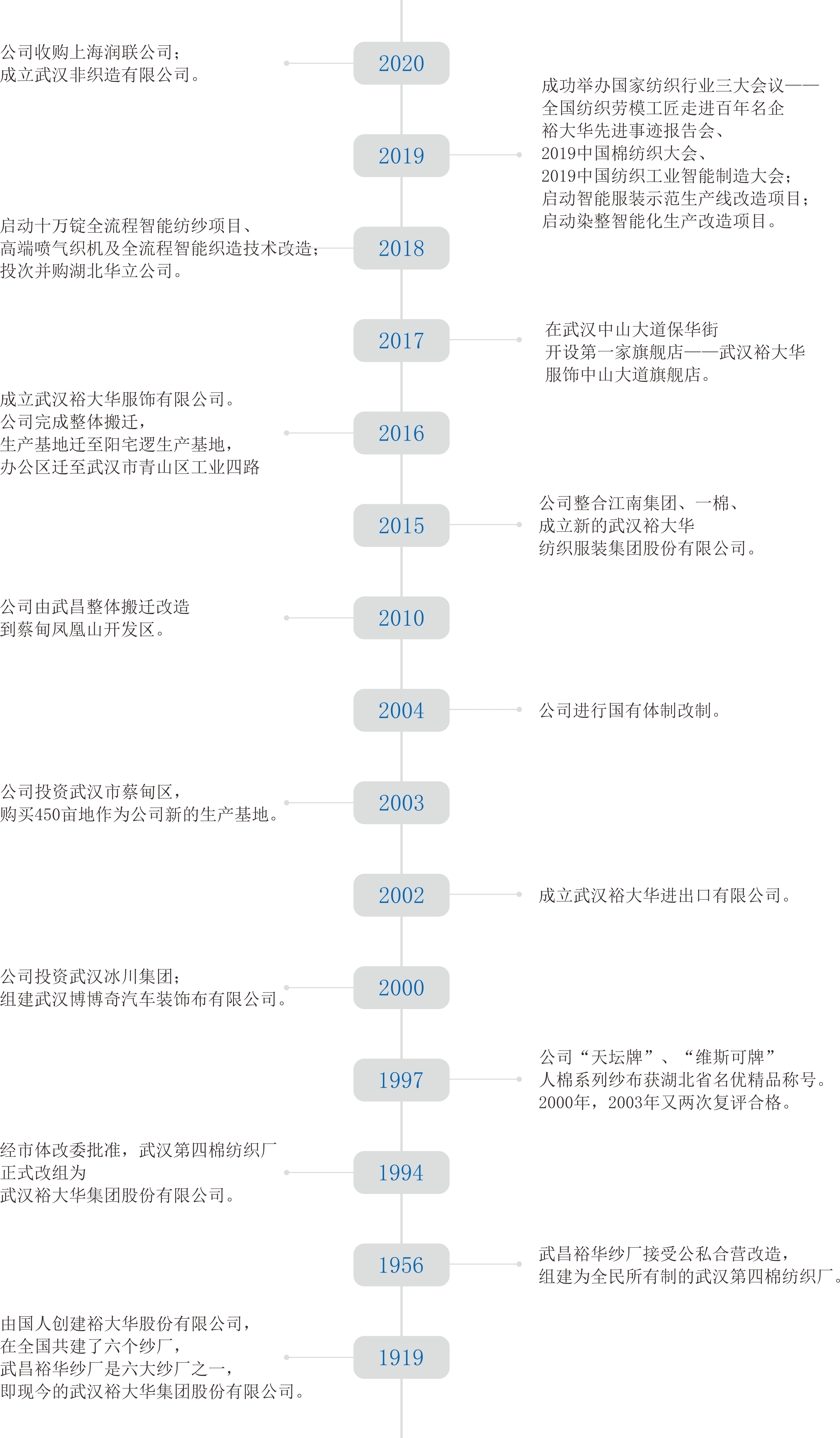 武汉裕大华纺织服装集团有限公司前身是创立于1919年的武昌裕华纱厂,参与和见证了中国民族纺织从无到有,不断发展进步的历史过程。2015年10月,武汉裕大华集团股份有限公司、武汉江南实业集团有限公司、武汉冰川集团股份有限公司及武汉一棉集团有限公司四家国有纺织服装企业重组整合,成立了武汉裕大华纺织服装集团。 集团实现重组后,开始了加速转型升级的发展之路,向产业链后端延伸,向价值链高端转型,按照“重组、创新、升级”的发展思路,打造“高端纺织制造”、“现代纺织服务”、“时尚纺织服饰”三大业务单元,逐步形成了原料贸易——纺纱——织造——印染——服装的完整产业链,致力成为国内一流的现代纺织服务商。